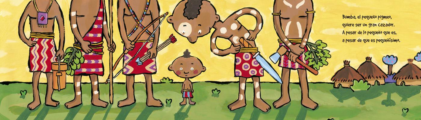 Bumba, el pequeño pigmeo, quiere demostrar que es un gran cazador, aunque él sea minúsculo. Se dirige amenazador a la jirafa, al cocodrilo y al león, pero todos se ríen de él. Así que cava un gran hoyo, lo cubre con hojas y atrae a los animales con una gran tarta de chocolate... ¿Caerán en la trampa?