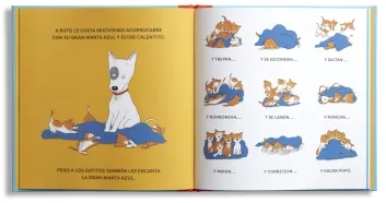 A Rufo no le gustan los gatitos porque trepan y roncan y lo miran y lo persiguen por todas partes, y, además, hacen popó. Tampoco le gusta compartir sus cosas, especialmente, su manta azul. Pero los gatitos tiran de ella hasta que la rompen y Rufo entiende que también hay otras maneras de estar calentito… ¡Y que jugar acompañado es mucho más divertido!